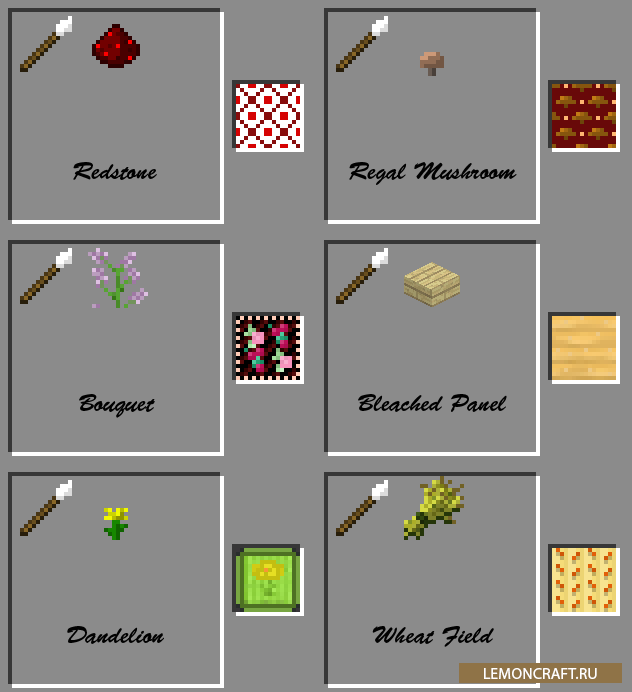 Мод Dooglamoo Painter добавляет возможность рисовать различные узоры на предметах с помощью специальных кистей и узорных блоков. Все узоры можно скрафтить из подручных средств. Теперь можно разукрасить свой дом, придав ему индивидуальность, что будет радовать глаз и украшать саму игру.
