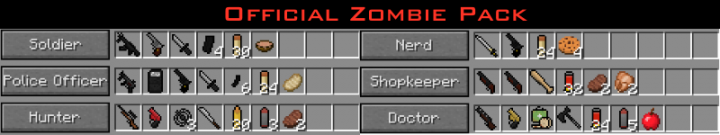 Пак Flan’s Zombie Pack для мода Flan’s добавит в игру новую классификацию игроков. Всего будет добавлено 6 классов игроков. Классификацию игроков вы можете увидеть на скриншотах. Каждый класс игроков будет иметь свое вооружение и снаряжение, которое позволит с успехом противостоять натиску этих ужасных зомби.